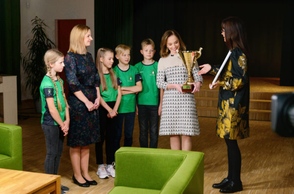 „Terevisiooni“ saates andis minister Liina Kersna Uulu põhikooli direktorile Egle Rumbergile ja õpilaste esindajatele üle tiitlikarika. „Terevisiooni“ saatejuhi Katrin Viirpalu käes on aukiri. Foto: Harno