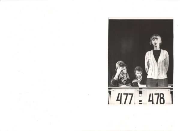 Katrin Nielsen lavakunstikooli 10. lennu tudengina Merle Karusoo lavastuses „Meie elulood”. Noormehed tema kõrval on kursusekaaslased Elmar Trink ja Andres Lepik. Numbrid noorte ees näitavad nende keskkooliaegset keskmist hinnet. Foto: erakogu