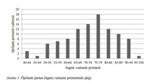 Õpilaste teksti mõistmise tase oli meil väga erinev, ulatudes 40%-st 100-ni (joonis 1). See on koolitöös suur väljakutse ja jääb vaid imestada, kuidas õpetajad sellega toime tulevad. Samas on see omane mitte ainult Eesti koolidele. PISA andmetel on kõikides riikides õpilasi, kelle testitulemused ja õpioskuste tase on 1–2 õppeaasta jagu madalam kui keskmine tase, samuti on õpilasi, kelle tulemused on 1–2 arenguaasta jagu paremad keskmisest tulemusest. Ülle Sääliku uurimusest ilmnes veel oluline täpsustus: metakognitiivsete õpioskuste tundmise poolest erinesid Eestimaa koolid üksteisest kaks korda rohkem kui erinesid õpilased ühes koolis. Mõnes koolis on õnnestunud õpilaste õpioskusi arendada rohkem kui teistes koolides.