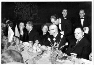 Soome president käis märtsis 1964 avamas Eesti jaoks akent Euroopasse. (Foto: yle.fi, Kulle Raigi erakogu.) Käbin (1905–1999) ja Kekkonen (1900–1986) olid peaaegu eakaaslased ja peaaegu sama kaua võimul kah, üks ühel, teine teisel pool Soome lahte. Kuigi öeldakse, et ega Käbinist kohapeal midagi sõltunud, siis omajagu ikkagi – Eestil oleks saanud ka palju halvemini minna. Käbini abikaasa Toini-Inkeri istub lõunalauas presidendi paremal käel. Kuuldavasti olnud Käbinite majakatusel vägev Soome TV antenn, Nõmmel üks esimesi ja võimsaimad.