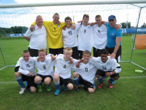 Eesti eriolümpia võidukas jalgpallimeeskond, kes pälvis 17.–21. juulini Rootsis Göteborgis Gothia Cupi raames toimunud Källströmi karikavõistlustel B-grupis hõbemedali. Tagareas vasakul koondise peatreener Lauri Rand, paremal abitreener Evo Saar. Foto: Tiina Möll