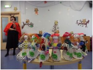 Järgmine ülesanne oli valmistada õpetajaga koos taaskasutatavatest materjalidest nukk Ökotriinu. Nobedad näpud tööle ‒ ja peagi oli valmis üheksa uhket nukku, kellele seoti ette Ökotriinu logoga põlled.