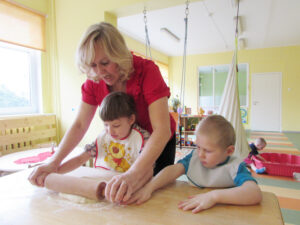 „Kui näen, et laps on mängust haaratud, siis ma loomulikult ei sekku, aga see ei tähenda, et ta võiks teha päev läbi seda, mida tahab. Teeme õppetegevuse ära ja pärast mängime nukunurgas ja ehitame klotsidest edasi, seal vajavad meie lapsed samuti täiskasvanu juhendamist ja tuge. Kõige tähtsam on arendusrühma lastele õpetada mitte tähti ja numbreid, vaid eneseteenindust ja igapäevaelus toimetulekuoskusi,” tõdeb Katrin Eentalu. „Nad kõik vajavad veel riidesse panemisel või söömisel vähem või rohkem abi. Varasematel aastatel on rühmas olnud ka ratastoolis ja täiesti lamavaid lapsi, praegune lend on selles osas väga tubli.”