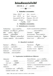 Hindamisleht aastast 1927.