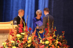 Tartu kutseharidus­keskuse 1. septembri aktusel andis õppedirektor Liivi Raudsepp saates „Rakett 69” edukalt esinenud Gert Leesile üle aasta teo tunnustuskirja. Foto: Morris Peedo