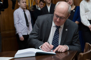 Eesti vabariigi 100. aastapäeva puhul tegi riigisekretär Heiki Loot sissekande Tallinna reaalkooli külalisteraamatusse. Fotod: Ingrid Kuusk