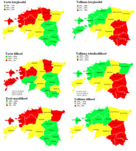Noorte ülikoolivalik jagab Eesti kirde-edela joonel kaheks: Loode-Eesti gümnasistid kipuvad jätkama õpinguid Tallinna ja Kagu-Eesti gümnasistid Tartu kõrgkoolides.