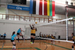 Eesti kutsekoolide võrkpallineiud (sinises) mängivad Läti vastu. Fotod: Pärnumaa KHK