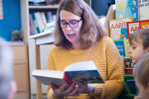 Käime terve aasta iga kuu Pääsküla raamatukogus lugemishommikul. Sinna on edasi-tagasi jalgsi minnes viis kilomeetrit, aga lapsed on harjunud. Ka rühmas on meil hubane lugemisnurk, kus on pehmed padjad ja väike riiul, kuhu paneme nädala teemaga seotud raamatud. Palju raamatuid on suures riiulis. Raamatuid ostab lasteaed, aga märtsis, kui iga rühm õpib selgeks ja esitab ühe näidendi, oleme teinud nii, et sissepääs peredele maksab ühe raamatu, mis ei pea olema uus, peaasi et on terve. Tänu sellele oleme saanud rühmale kastitäie raamatuid, mõni pere on toonud lausa mitu.