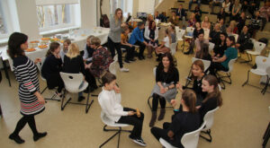 Kristiina Treial viib läbi kiusamisvaba kooli näidistundi. Koolilapsed ja täiskasvanud on koondunud mõtlemispesadesse. Fotod: Raivo Juurak