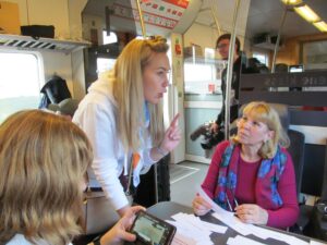 Milline on hea kool? Kui tihti sõidate rongiga? Kas te käite ekskursioonidel? Kus te puhkate? Ja nii edasi. Vastused tulid lühilausetega, mõnesõnalised ja pikemadki ning rääkida sai igaüks. Pool vagunit oli keelehuviliste hõivatud. Reisi kestel kosutati end kohviga ja kutsuti sisenenud reisijaidki keeletunnis osalema ning kohvi jooma. Enamasti jäid kutsutud ettevaatlikult umbusklikuks.