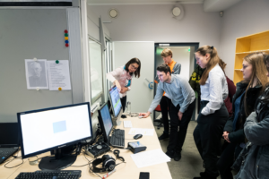 TÜ foneetika laborit tutvustavad külalistele eesti ja üldkeeleteaduse instituudi nooremteadur Helen Türk ning doktorandid Katrin Leppik ja Anton Malmi. „Foneetika on hääldusõpetus, mis tegeleb kõneloome ja kõnetuvastuse ning kõne akustilise ehituse analüüsiga,“ lausus Katrin Leppik. Tegu on keele- ja täppisteaduse vahepealse haruga, millel on ühisosa nii füüsika kui ka meditsiiniga. Foneetikul läheb vaja teadmisi keeleteadusest, statistikast ja matemaatikast.
