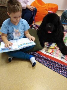 Aimar loeb ja lugemiskoer Leero kuulab huviga.
