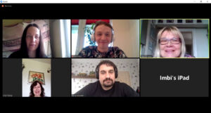 Ekraanitõmmis Zoomi vestlusringist. Ülemises reas Fee Tamm, Alo Savi, Sirje Pärismaa. Alumises reas Imbi Viisma, Urmo Uiboleht.