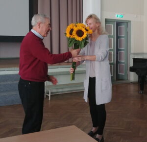 Emeriitprofessor Jaan Kõrgesaar võtab õppevahendi esitlusel vastu õnnitlussõnu professor Äli Leijenilt. Foto: Tartu ülikool