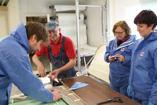 TLÜ Haapsalu kolledži käsitöötehnoloogiate ja disaini õpilastega oleme juba neli aastat teinud nii, et nad töötavad läbi e-õppe materjali ja seejärel valmistame oma õppetöökojas nendega koos nende tooted: valmistame vormi, teeme ettevalmistused lamineerimiseks, lamineerime, lõikame jne.