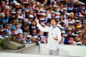 See tuli justkui iseenesest. „Püha on maa“ on esimene fraas Hando Runneli luuletusest „Valgust!“, mis algab sõnadega „Püha on maa ja ta järved on pühad, kiitust me tahame laulda neil kaldail“. Omamoodi ongi see puhtuse igatsusest kantud laulupidu, mille sõnum on, et maa, loodus, maailm, aga ka inimene, kes selles maailmas elab, on püha. Soovisin esile tuua lugupidamist, austust, viisakust – kõige paremas mõttes vana kooli väärtusi. Tihti on noortelaulupeod stereotüüpidele vastavalt hästi aktiivsed, reipad, nooruslikud. Kuna ma ise olin teistsugune noor, otsustasingi ideekonkursil kandideerida introvertsemate noorte, ütleksin isegi et koorinohikute kaitseks. Arvan, et noori võib usaldada ja usun, et nad tulevad nende väärtustega kaasa. Laulupeo kunstiliseks juhiks kandideerides ei olnud mul plaanis seda konkurssi tingimata võita, vaid jagada komisjoniga oma väärtusi, aga läks nii, et see töö valiti.