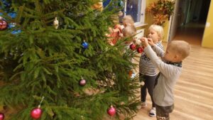 Esimest adventi tähistasime, lauldes koos jõulu- ja talvelaule. Üks õpetaja saatis kitarril ja lapsed laulsid kõik kenasti kaasa. Rühmadel on loomade nimed – Mõmmide, Siilide, Oravate ja Jäneste rühm – ja pärast laulmist pani iga rühm oma nimelooma juurde seinale esimese advendiküünla. Ka päkapikud olid kuuse alla üllatuse poetanud.