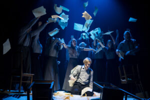 Lavakunstikooli 30. lennu noored näitlejad Juhan Liivi elust ja loomingust kõnelevas lavastuses „Sihtisid pole sel sillal“. Foto: Sabine Burger
