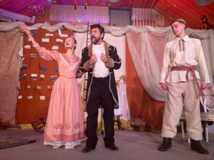 Lavastuse „Jõulumõõk“ tegelased Amalie, kindral Pahlen ja Vidri Rein. Foto: Teater Nuutrum