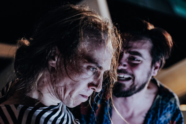 Raskolnikovi (Ursel Tilk) ja Porfiri Petrovitši (Priit Võigemast) duell võtab aina ohtlikumaid pöördeid Ene-Liis Semperi ja Tiit Ojasoo lavastuses „Kuritöö ja karistus“. Foto: Gabriela Urm