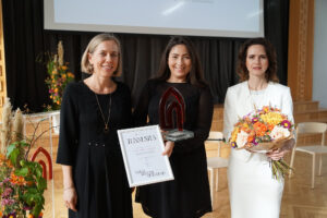 Haridusuuenduse auhinna 2022 pälvis Tartu Forseliuse Kool. Vasakult Tallinna Ülikooli haridusinnovatsiooni prorektor Kristi Klaasmägi, Tartu Forseliuse Kooli eripedagoog Laura-Liis Lepp, Tallinna Ülikooli haridusteaduste instituudi direktor Tiia Õun. Foto: Piret Räni