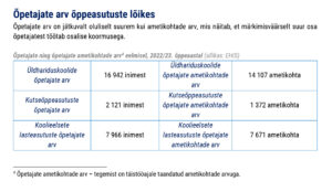 Eesti koolis töötas jaanuari seisuga 99 sõjapõgenikust õpetajat, 31 abiõpetajat või õpetaja abi, 23 koristajat, 11 kokka või söökla abitöölist, 10 psühholoogi, 9 tugiisikut, 7 õppetöö koordinaatorit, 4 logopeedi ja 3 sotsiaalpedagoogi. Teadmata ametikohal töötas kolm sõjapõgenikku.