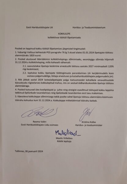 Aga vaatame nüüd ka suurt pilti. Esimest korda Eesti ajaloos on riiklikult algatatud õpetajate palga ja töötingimuste parandamiseks pikaaegse kollektiivlepingu sõlmimise protsess. Ehk riik võtab endale pikaaegsed kohustused, seda ka eelarvestamisel. Detsembris anti EHL-ile selgelt mõista, et selliseid volitusi ega soovi kollektiivlepinguga edasi minna haridusministrile ei anta. Me allkirjastasime lepingu, mis paneb riigile kohustuse, ning lepingu punktide rikkumise korral katkeb töörahu automaatselt. Me tõime lauale alushariduse ja kutsehariduse palgateema, millega minnakse edasi.