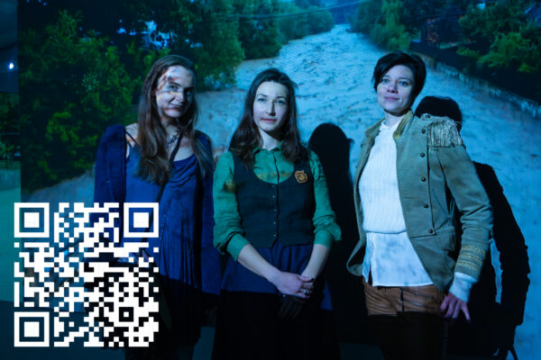 Tallinna Kunstihoone haridusprogrammide kuraatorid Minni Hein, Aljona Tubaleva ja Olesja Katšanovskaja-Münd Hanna Samosoni näitusel „Võlukunst on mõnikord lähedal eimillelegi“. Skänni QR-kood ja saa teada, miks tasub klassijuhatajatunni raames näitust külastada! Foto: Roman-Sten Tõnissoo