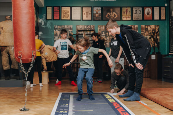 Spordimuuseumi külastusjuht Joosep näitab programmis osalejatele painutusharjutust. Fotod: Andrea Margó Rotenberg