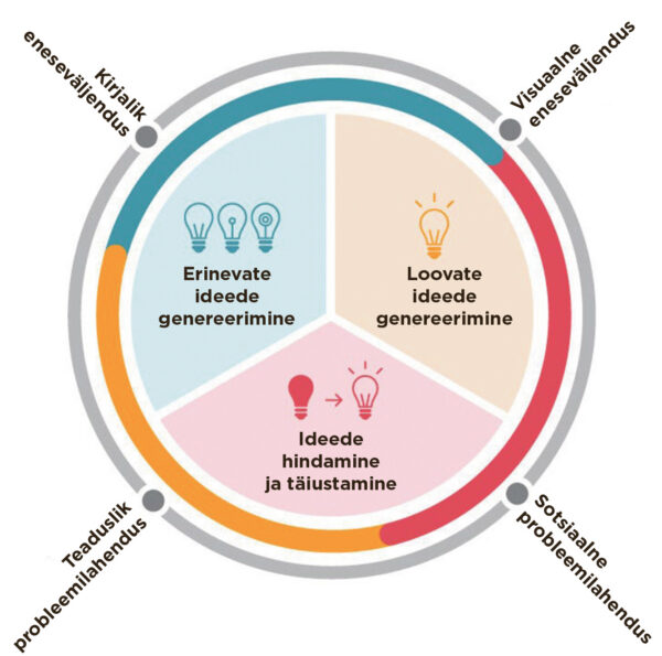 Ideede genereerimise protsesside lõikes on meie õpilased parimad originaalsete ideede genereerimises (maksimaalse skooriga ülesannete osakaal 52%). Madalamad tulemused saadi ideede genereerimise ning olemasolevate ideede täiustamise ja edasiarendamise eest. Siin võiks edasiseks aruteluks visata õhku väite, et meie õpilane on endiselt harjunud toimetama pigem üksi kui grupis, sest ideid genereeritakse ning juba väljapakutuid parandatakse tihti koostöiselt ja rühmaarutelude käigus.