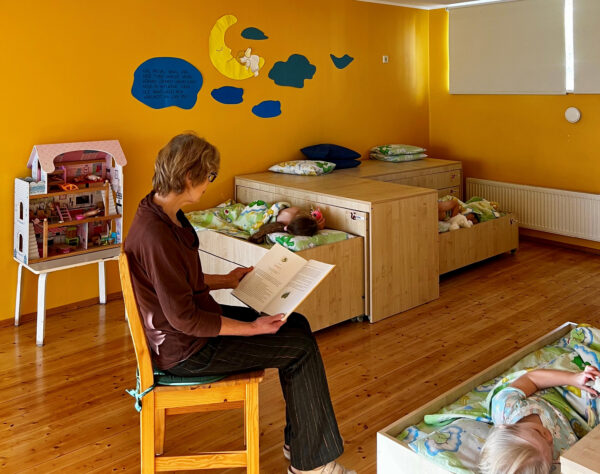 Oravate rühma puhkeaeg Muhu lasteaias algab sissejuhatava salmiga, mida loetakse üheskoos, kui kõik lapsed on ennast mõnusasti vooditesse sättinud. Seejärel loeb rühmaõpetaja lastele toredaid lugusid, mis toetavad nädala õpiteemat. Foto: Muhu lasteaed Munuke