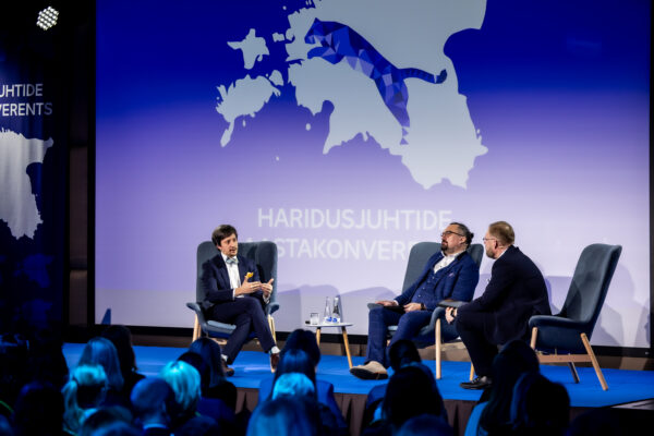 Luukas Ilves koolijuhtide ühenduse esimehe Urmo Uibolehe ja konverentsi vestlusjuhi Urmas Vaino küsimustele vastamas. Fotod: Erlend Štaub