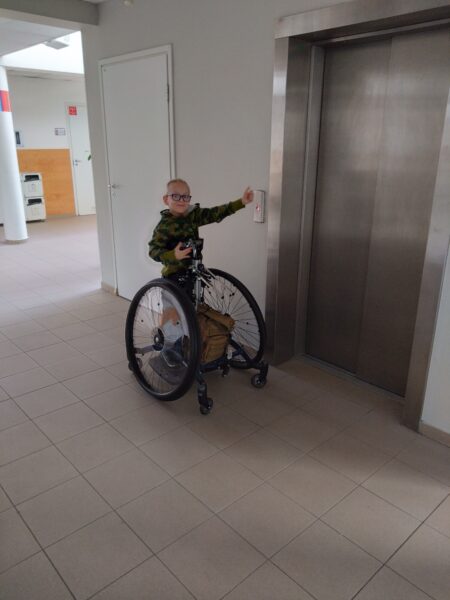 Klerkon kasutab mitmesuguseid abivahendeid: jalaortoose, et ta saaks püsti seista, spetsiaalselt tema jaoks kohandatud koolilauda, kõnniraami ja seisulauda, samuti õues käimiseks mõeldud tagant lükatavat jalgratast. „Kui eelmisel aastal kasutasime rohkem kõnniraami, siis sel aastal seisulauda, mis jätab käed vabaks ja millega on parem manööverdada. Kehalise kasvatuse tunnis saalihokit mängides oli poiss väga õnnelik, kui tal õnnestus pall väravasse lennutada. Seisulauaga saab ta ka kiiremini edasi liikuda, poole tunni asemel kulub meil nüüd 10–15 minutit, et oma klassist muusikaklassi või võimlasse jõuda. Paljusid asju tahabki ta ise teha, näiteks liftinuppu vajutada, mis on tema jaoks väga suur töö, sest käed ei kuula hästi sõna. Nuputamegi koos, kuidas ta midagi teha saaks. Ta on tubli ja tal on palju tahtejõudu,“ kiidab tugiisik.