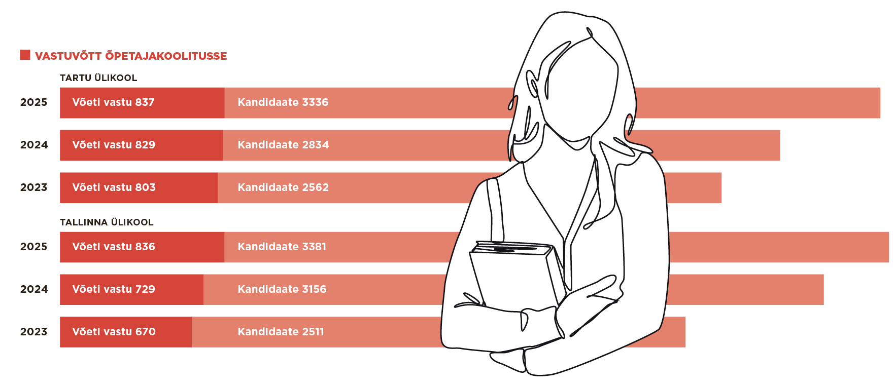 2023. aastal immatrikuleeriti õpetajaõppe ja haridusvaldkonna erialadele 670 üliõpilast ning avaldusi laekus 2511 (keskmiselt 2,52 tahtjat kohale). Mullu avati 729 õppekohta (3156 avaldust, keskmiselt 3,1 tahtjat kohale). Tänavu on õppekohti 836 ning avaldusi laekus 3381 (4,04 tahtjat kohale).