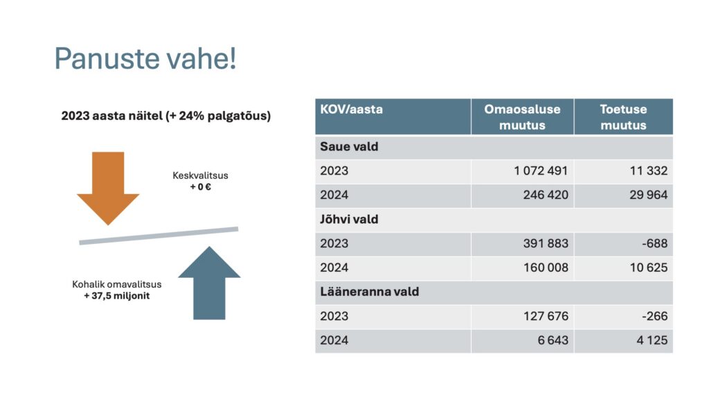 Eesti Linnade ja Valdade Liit (ELVL) ei teinud riigieelarve läbirääkimistel ettepanekut viia õpetajate palga toetusfond omavalitsuste tulubaasi. Põhjuseks põhimõte „kes lubab, see maksab“. Keskvalitsus on lubaduse andnud, seega peab selleks ka raha eraldama. Küll aga toetas ELVL lasteaiaõpetajate palga toetusfondi viimist tulubaasi, sest sealne rahastus ei ole kasvanud samas tempos kui palgasurve. Kahjuks ei leidnud ka see ettepanek toetust. Väidetavalt pole omavalitsused usaldusväärsed. Aga kui vaadata konkreetseid andmeid, siis tekib küsimus, kas see kahtlus on ikka põhjendatud.