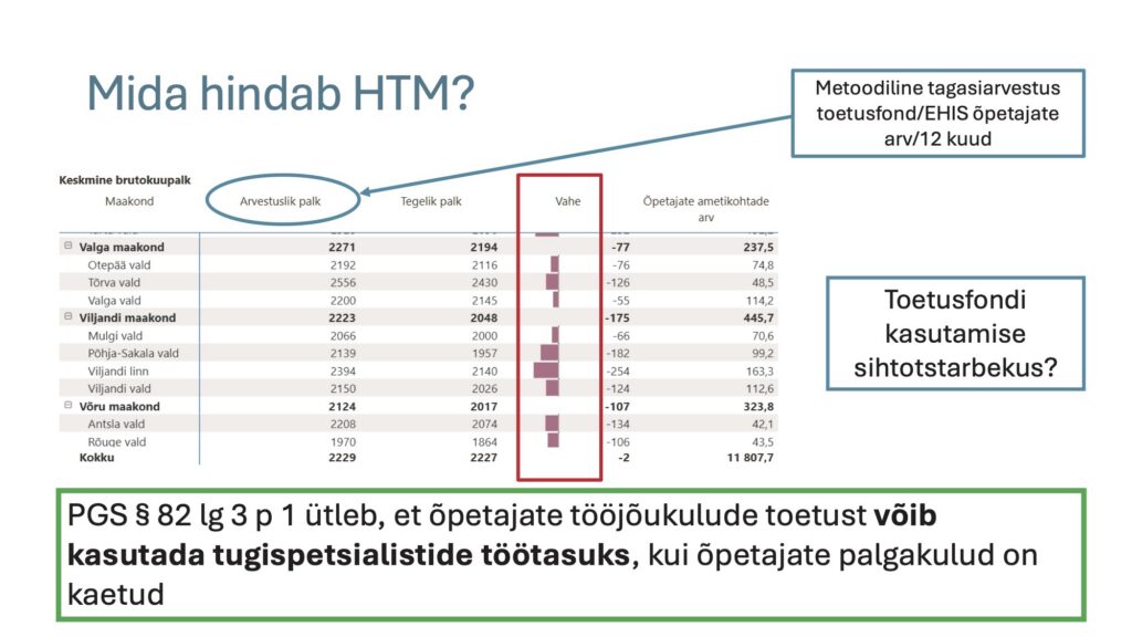 Lisaks on Haridussilma portaalis joonis, mis näitab, kui palju toetust omavalitsus õpetaja kohta saab ja kui palju ta seda kasutab. Esmapilgul tundub see informatiivne, kuid tegelikult on eksitav. Arvutustes kasutatakse EHIS-e andmeid, mis ei pruugi olla usaldusväärsed. Ei arvestata ka, et õpetajate palgafondi on lubatud kasutada lisaks tugispetsialistide töötasuks. Sellise vaatega pannakse omavalitsused ebaõiglaselt häbiposti ning just sealt tekibki suhtumine, et „raha ei jõua õpetajateni“.