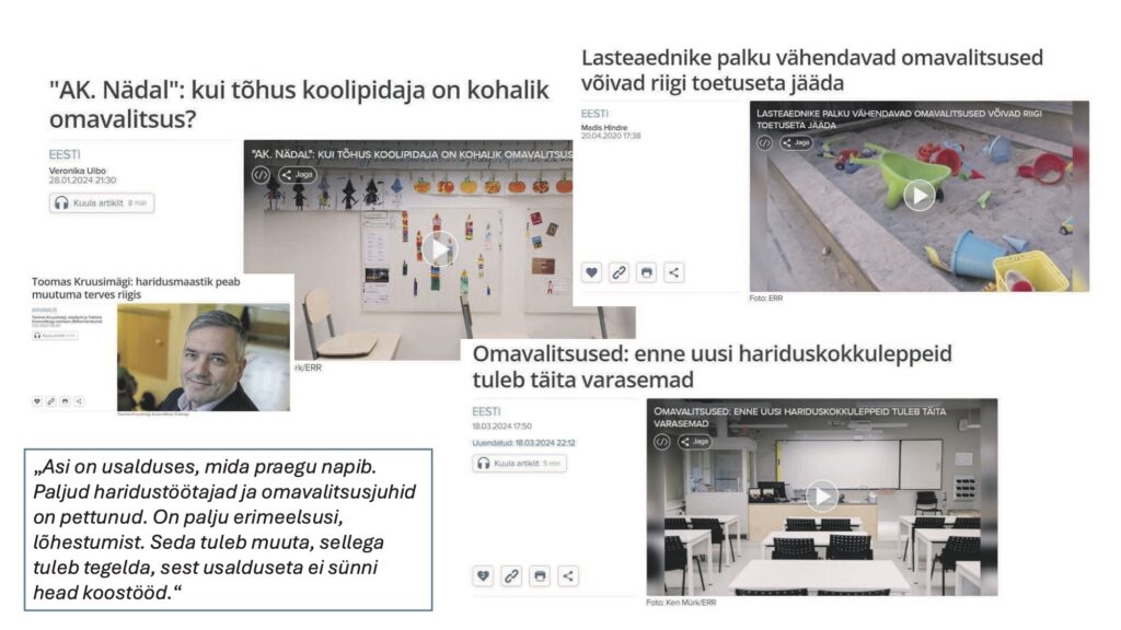 Kui liikuda tagasi esimese probleemi juurde, siis küsin, kus see probleem välja paistab. Meedia suudab iga probleemi võimendada. Sealt võime näha, kuidas ministeerium heidab omavalitsustele ette, et raha ei jõua õpetajateni, või lausa ähvardab vähendada toetust, kui omavalitsused ei kasvata palkasid samas suurusjärgus kui keskvalitsus. Samal ajal on näha omavalitsuste vastupanu – nad ei ole nõus ministeeriumiga uusi kokkuleppeid sõlmima, sest varasemad lubadused on jäänud täitmata.