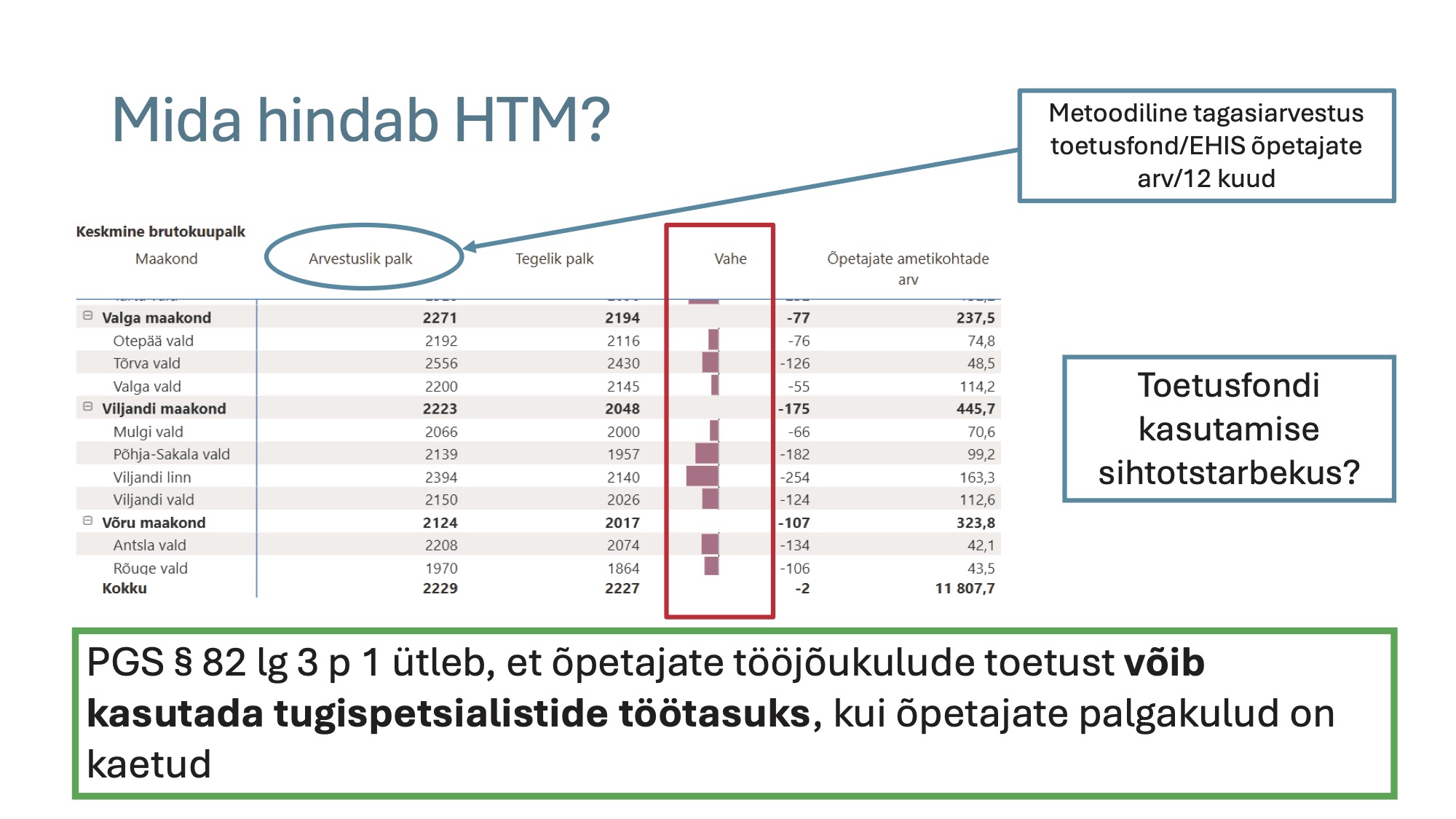 Samal ajal on haridusleppes seatud siht, et üldhariduskooli õpetaja palk peab ulatuma 120%-ni riigi keskmisest. Selle saavutamiseks peaks omavalitsus suunama 60% üldhariduskuludest õpetajate palgafondi. Idee tundub selge ja sirgjooneline, kuid tegelikkus on keerulisem. On omavalitsusi, kus õpetajate palk ületab 120% riigi keskmisest, kuigi palgafondi osakaal hariduskuludes jääb alla 60%. Samas leidub omavalitsusi, kus see osakaal on eesmärgile lähemal, kuid palk jääb seatud eesmärgist allapoole. Eelarveproportsioonide ja palgataseme seoste analüüs ei kinnita, et õpetajate palgafondi suurem osakaal hariduskuludes toob automaatselt kaasa kõrgema palga (allikas: riigiraha.fin.ee).