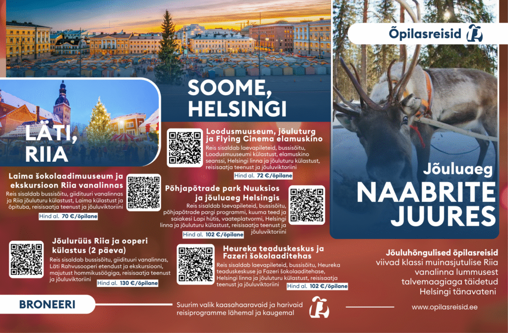 Meie reisikorraldajad aitavad leida just sinu klassile ideaalse reisi aasta ringi, aga jõuluajal soovitame piiluda, kuidas naabrid pühi tähistavad – muinasjutuline Riia ja talvemaagiline Helsingi ootavad.