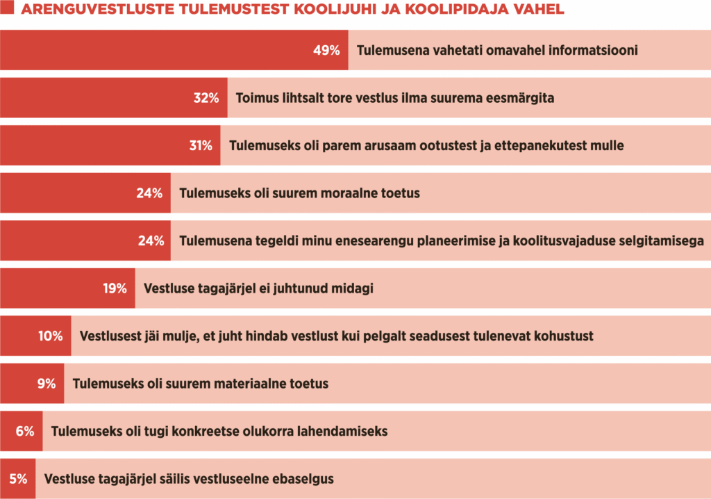 Umbes pooled koolijuhid märkisid, et on käinud viimase aasta jooksul koolipidajaga arenguvestlusel, kuid vestluste tulemuslikkust hinnati tagasihoidlikult (vt joonist). Kõige sagedamini toodi välja, et vestlusest kujunes info vahetamine või üldine jutuajamine konkreetsete kokkulepeteta. Kolmandik juhte leidis, et arenguvestlus oli tore vestlus suurema eesmärgita.