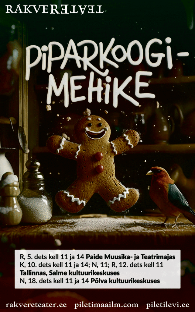 Peale päkapikuloo pakume vaatamiseks mullu väga hästi vastu võetud muusikalist lastelavastust „Piparkoogimehike“, milles seiklevad köögiriiulil tegelased, keda me köögis ikka kohata võime, aga kelle elust meil alati ettekujutust pole. Ahjusoe Piparkoogimehike avab silmad ja õpib tundma maailma, teejuhtideks pipardav Sool, soolav Pipar, elunäinud Teepakk, Herr Kellakägu ja Ülbe Hiiremutt. Sedapuhku saab armastatud jõulumuinasjuttu näha eri paigus: 5. detsembril Paide Muusika- ja Teatrimajas, 10.–12. detsembrini Salme Kultuurikeskuses ning 18. detsembril Põlva Kultuuri- ja Huvikeskuses. Seegi lavastus on kahes vaatuses ja soovitav alates 4. eluaastast.