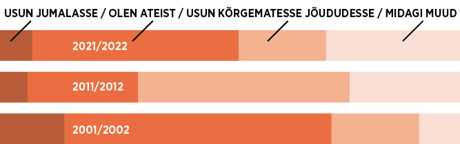 Huvitaval kombel ütles 2001/2002. õppeaastal väga palju õpilasi, et nad usuvad kõrgematesse jõududesse, nüüd kuuleb seda vähem. Rahvaloenduse andmetel on nn uskujate protsent Eestis 30, maailmas aga 85 kandis.