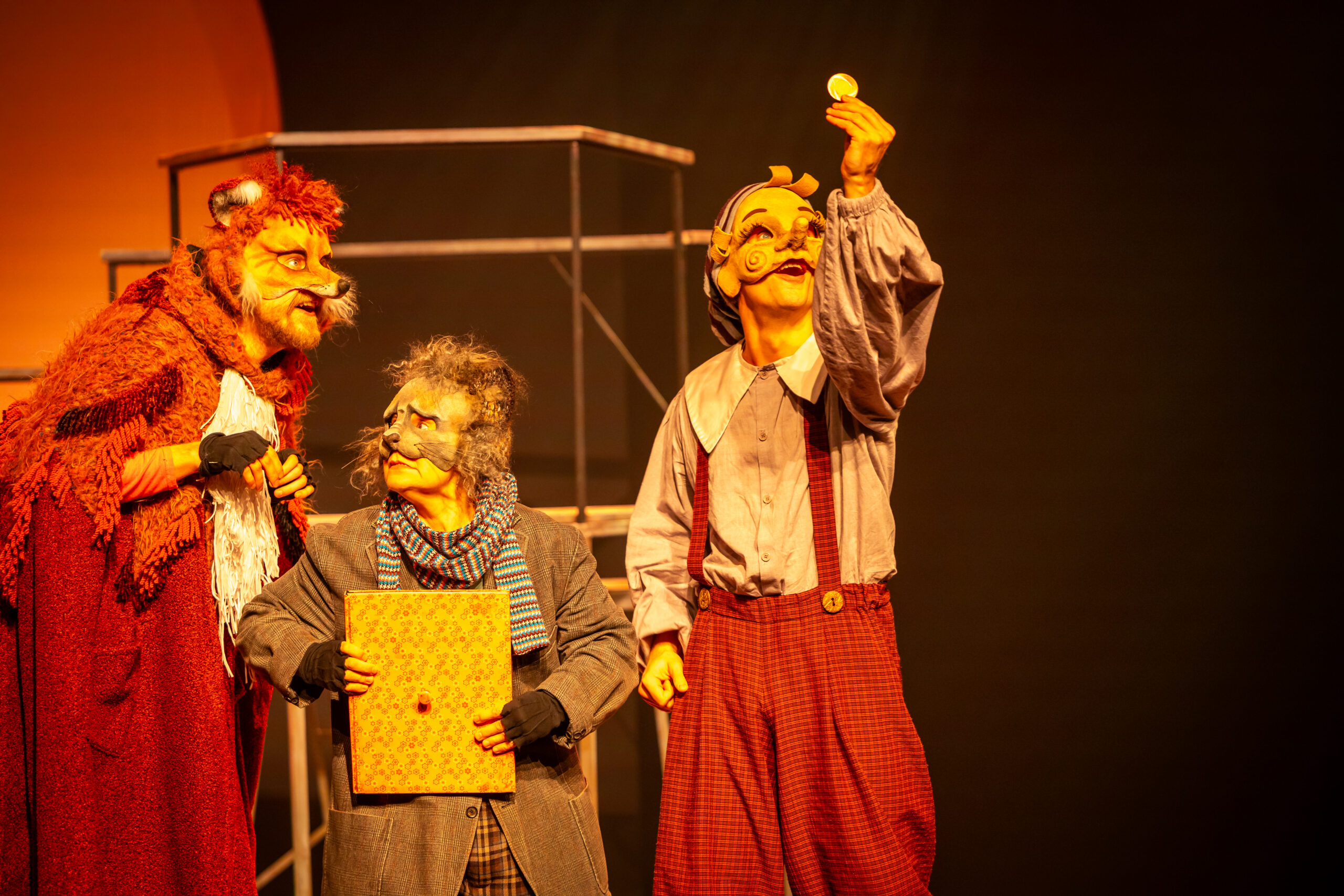 Sarnaselt Hotzenplotziga kasutatakse ka nüüd commedia dell’arte poolmaske, selle teatritraditsiooni tegelaskujudest on laval ainult Arlecchino ja põgusa hetke ka Pulcinella, Collodi raamatusse kirjutatud tegelased. Nukkudeks on üks suur mitmekesi juhitav lauanukk – Pinocchio esineb nii nuku kui näitlejana – ning lind ja madu.