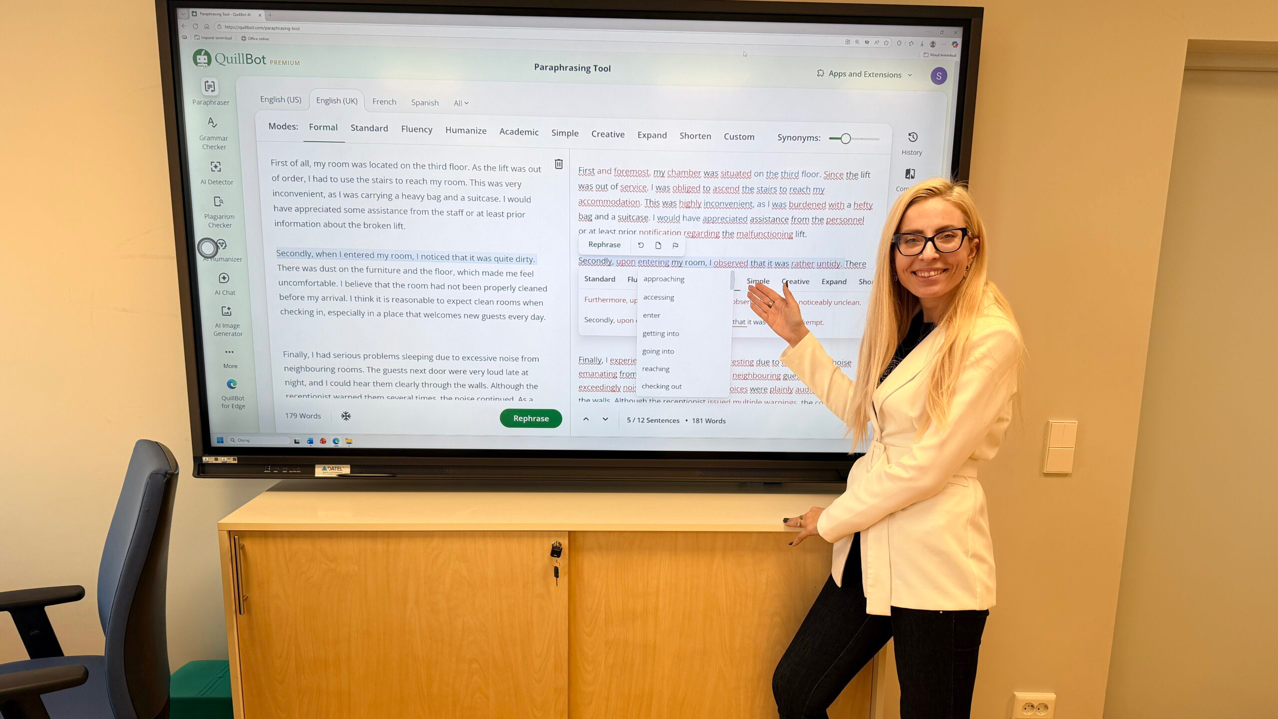 Enim olen aga vaimustuses akadeemilise kirjutamise toetamisest. Õpilasi peab sageli juhendama, et nad mõistaksid mitteametliku ja ametliku keelekasutuse ning keeletasemete erinevust, aga ka selleks, et nad teadvustaksid, kuidas sõnastus, sõnavara ja grammatika muutuvad vastavalt keeleoskustasemele. Näiteks peab õpilane, kelle eesmärk on sooritada edukalt CAE-eksam, mõistma, mille poolest erineb B2- ja C1-tasemel kirjaviis, ning milliseid keelevalikuid C1-tase eeldab. Selles on eriti tõhusad Write and Improve’i platvorm ning QuillBot, mis aitavad esile tuua keelekohandusi vastavalt teksti eesmärgile ja soovitud tasemele. Tundides on väga väärtuslik analüüsida neid muudatusi koos õpilastega, pöörates tähelepanu sõnastuse, stiili ja registri erinevustele.