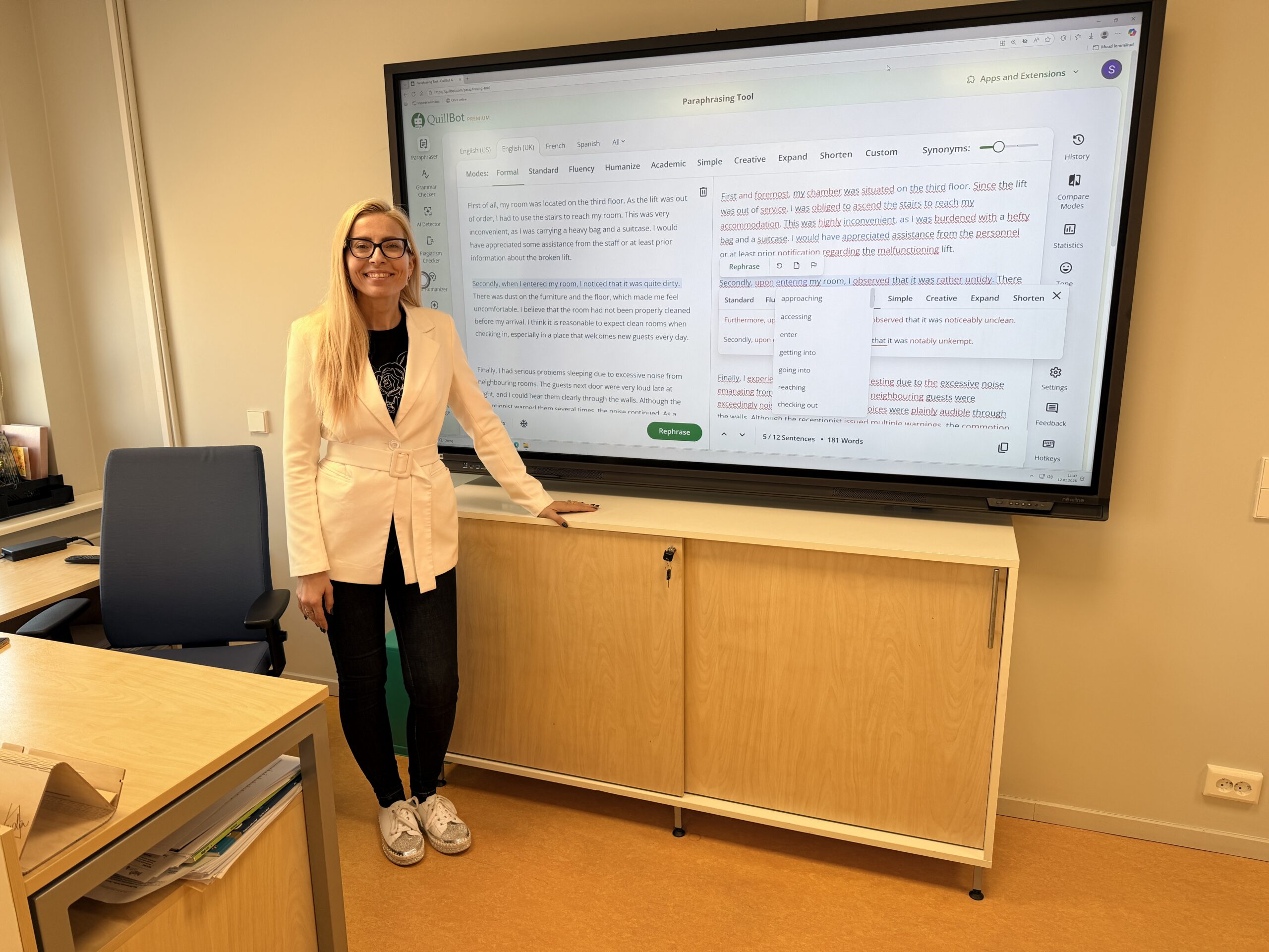 Enim olen aga vaimustuses akadeemilise kirjutamise toetamisest. Õpilasi peab sageli juhendama, et nad mõistaksid mitteametliku ja ametliku keelekasutuse ning keeletasemete erinevust, aga ka selleks, et nad teadvustaksid, kuidas sõnastus, sõnavara ja grammatika muutuvad vastavalt keeleoskustasemele. Näiteks peab õpilane, kelle eesmärk on sooritada edukalt CAE-eksam, mõistma, mille poolest erineb B2- ja C1-tasemel kirjaviis, ning milliseid keelevalikuid C1-tase eeldab. Selles on eriti tõhusad Write and Improve’i platvorm ning QuillBot, mis aitavad esile tuua keelekohandusi vastavalt teksti eesmärgile ja soovitud tasemele. Tundides on väga väärtuslik analüüsida neid muudatusi koos õpilastega, pöörates tähelepanu sõnastuse, stiili ja registri erinevustele.
