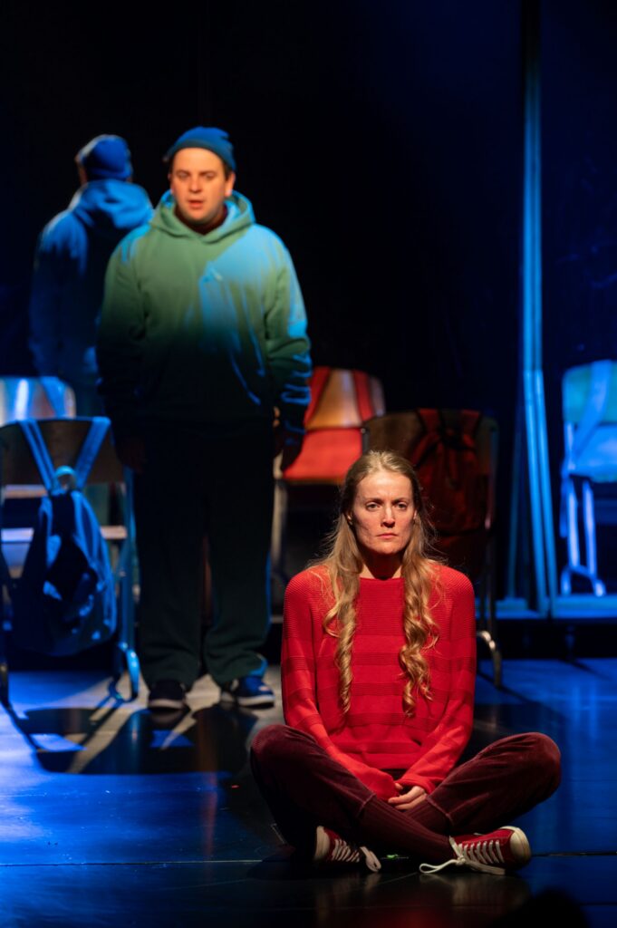 Kiusajad lõbustavad ennast sotsiaalmeedias postitatud julma pilkesõna ohvrile nina alla torgates. Fotol vasakult Jürgen Gansen Lauri rollis, Maarja Tammemägi Malvana ja Silva Pijon Eetuna.
