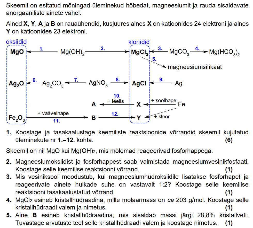 Ülesanne 9. klassi keemiaolümpiaadi koolivoorust, mis keskendub anorgaanilistele ainetele