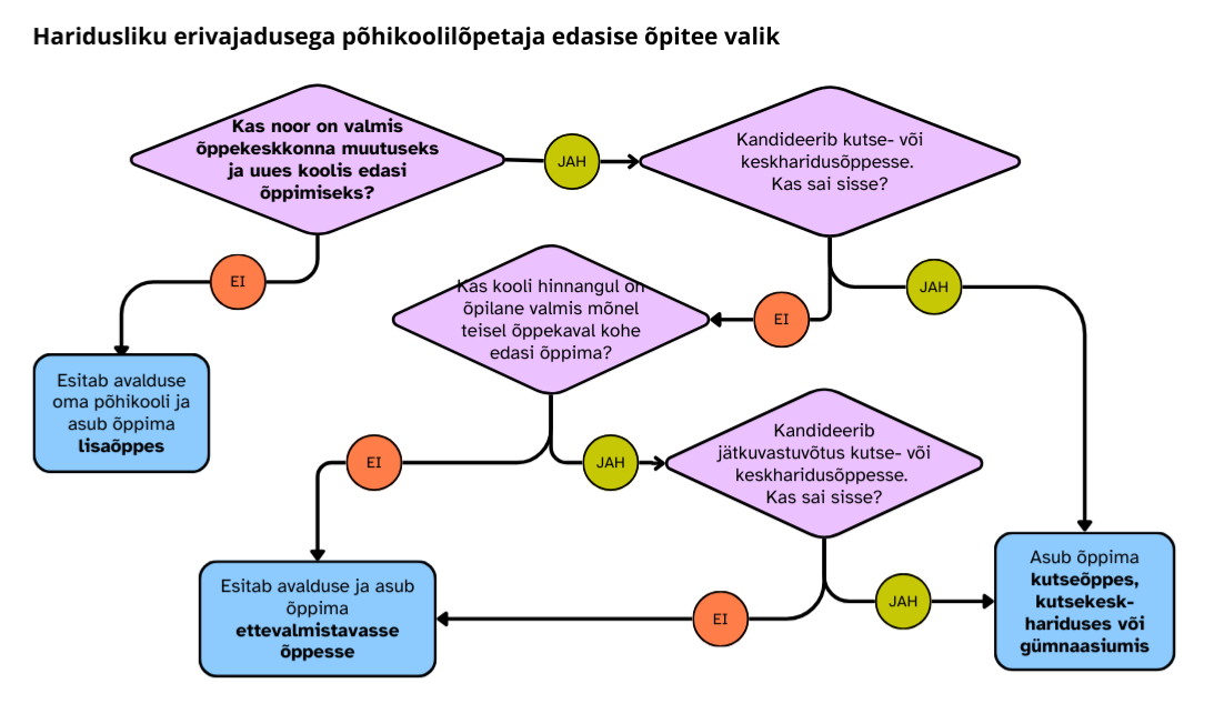 Kõigi põhikoolilõpetajate puhul on eelistatud valik jätkamine tasemeõppes ehk üldkeskhariduse suunal gümnaasiumis või kutsekoolis, kus on valikus nii rakendusliku keskhariduse kui ka kutseõppe õppekavad. Haridusliku erivajadusega õpilased on sama erinevad kui tavaõpilased: nende võimed, huvid, motivatsioon ja tulevikuplaanid võivad varieeruda suurel määral. Õppija toevajadus sõltub aga keskkonnast, kus ta iga päev õpib ja elab. Näiteks mõni autismispektri häirega laps, kes suurte klassidega koolis vajab õpet eriklassis, võib väikeste klassidega väikeses koolis õppida edukalt tavaklassis. Just seetõttu peab ka edasiõppimine lähtuma noore huvidest ja tugevustest, mitte diagnoosist või toe liigist.