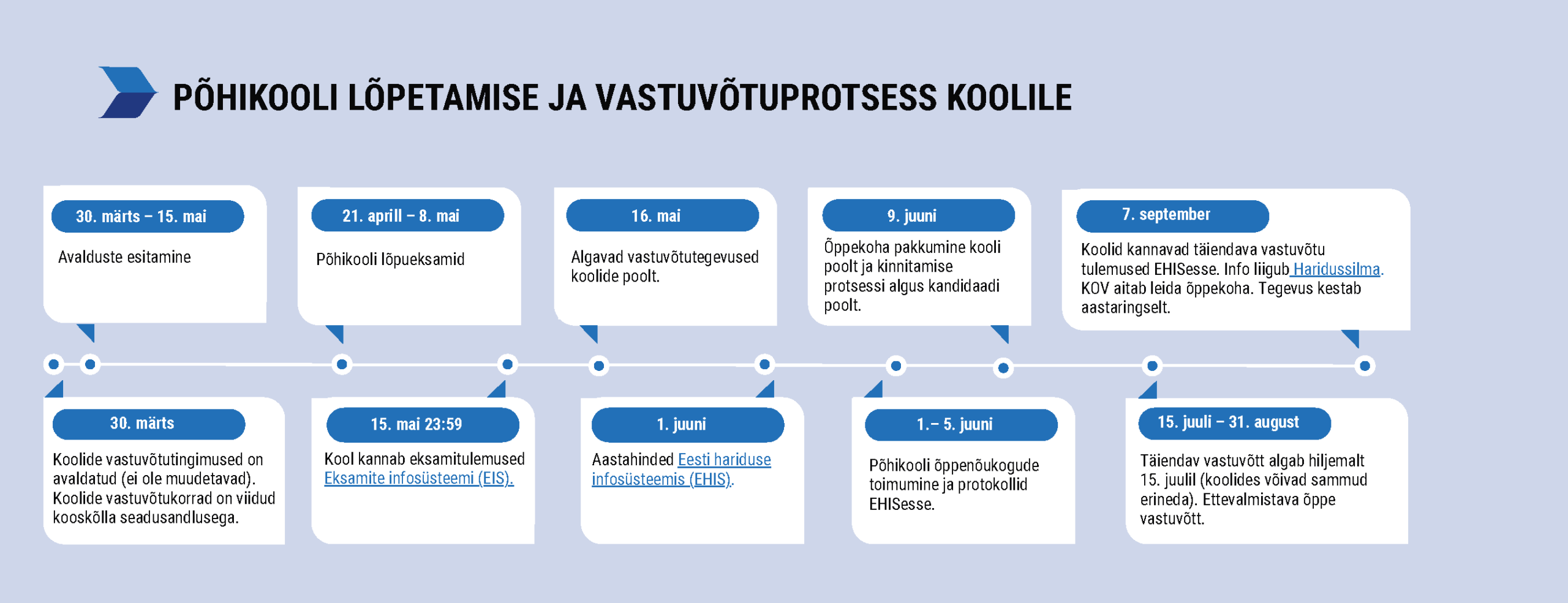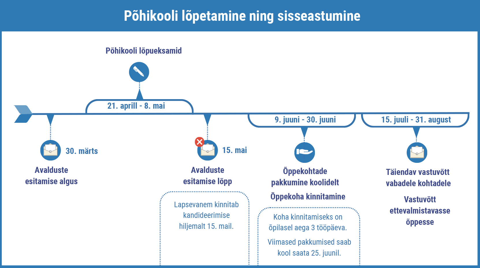 Tänavu kevadel saavad põhikoolilõpetajad hakata avaldusi esitama üld- ja kutseõppesse 30. märtsil ning avalduste vastuvõtt kestab 15. maini. 16. maist 8. juunini saavad koolid korraldada vastuvõtutegevusi (nt katsed ja vestlused). Alates 9. juunist hakatakse õpilastele pakkuma õppekohti ning põhivastuvõtt lõpeb 30. juunil. Täiendav vastuvõtt algab hiljemalt 15. juulil ja kestab 30. augustini.